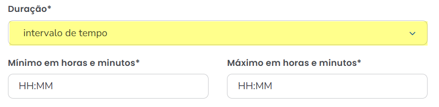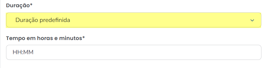 Duração: este campo permite que você escolha um tempo de duração que será estabelecido este Tipo de agendamento, dividindo em três tópicos: