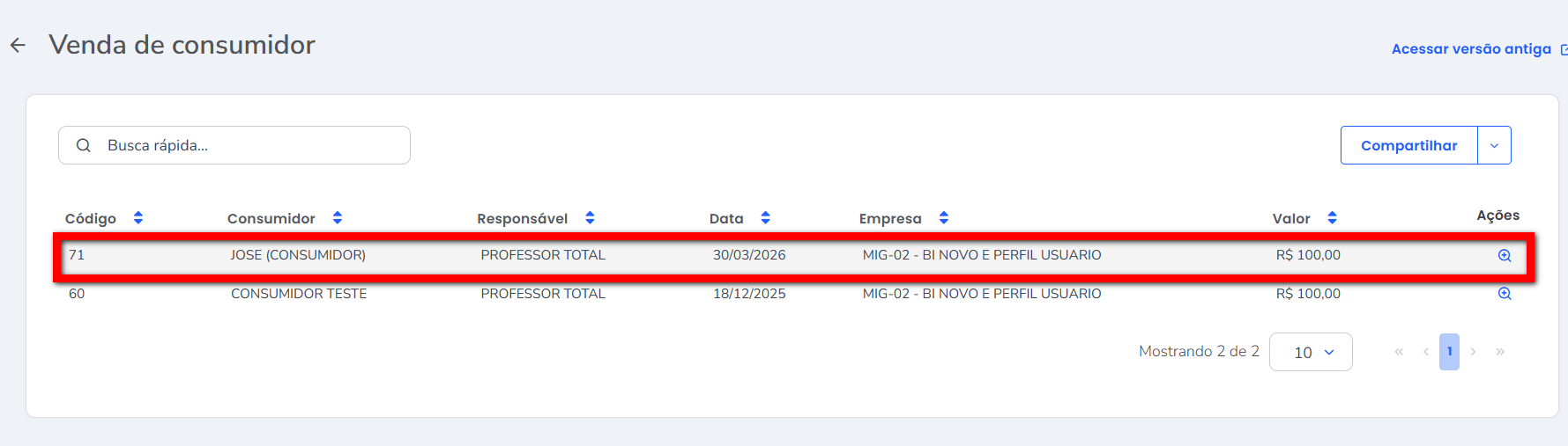 2. Será apresentado uma nova tela exibindo todas as vendas realizadas para consumidor registradas na sua empresa. Localize a venda que deseja estornar e clique nela;
