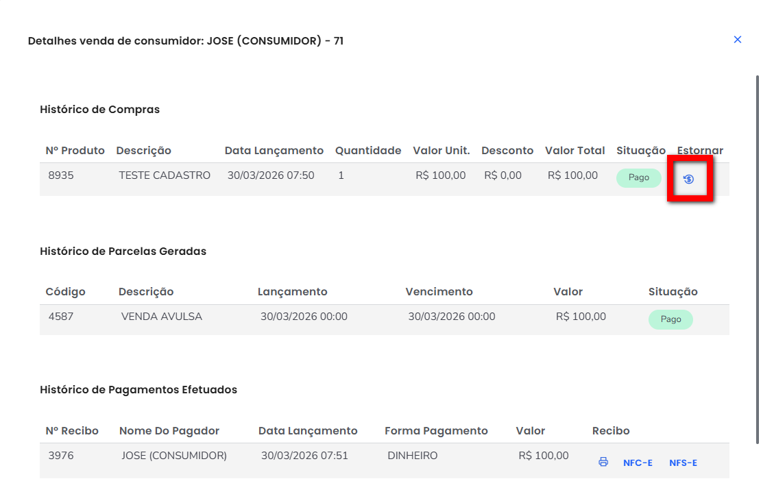 Para isso temos o recurso de Venda de Consumidor, onde permite realizar o estorno da venda.