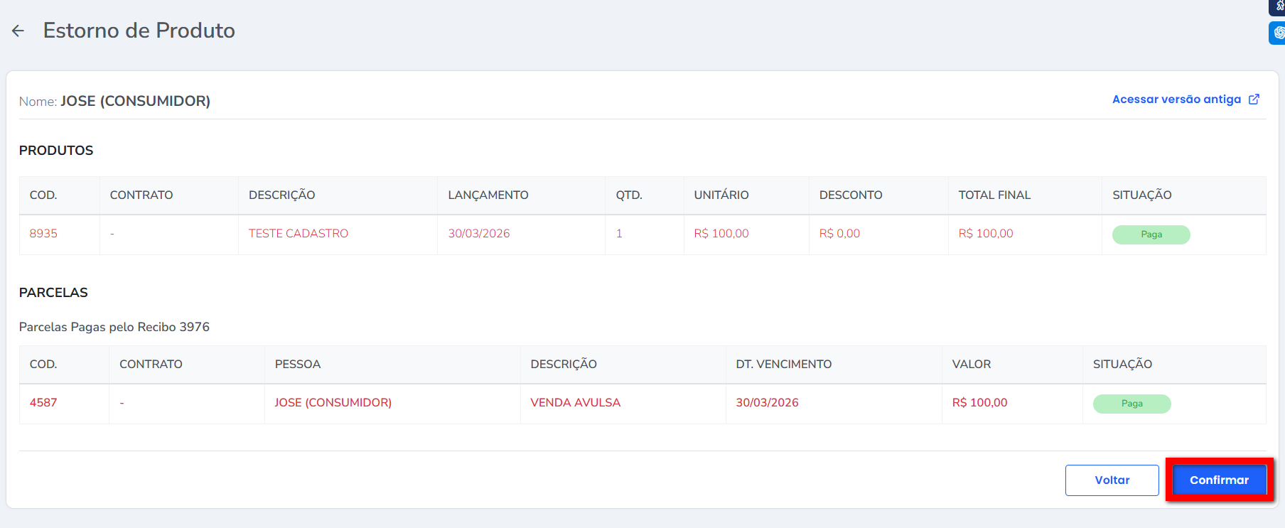 4. Por fim, clique em "Confirmar";