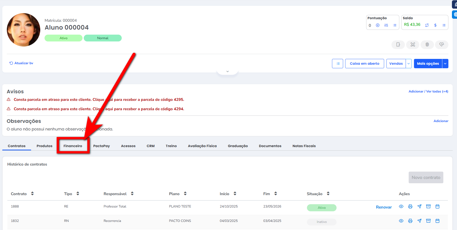 1. Acesse o perfil do cliente que deve ser estornado o produto e clique na guia "Financeiro";