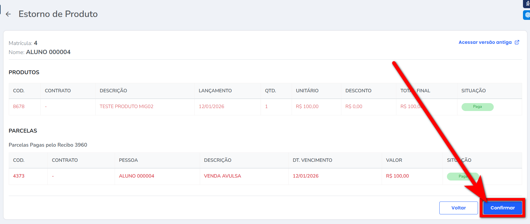 4. O sistema irá apresentar uma nova tela indicando detalhes desta compra. Clique em "Confirmar" para estornar o produto.