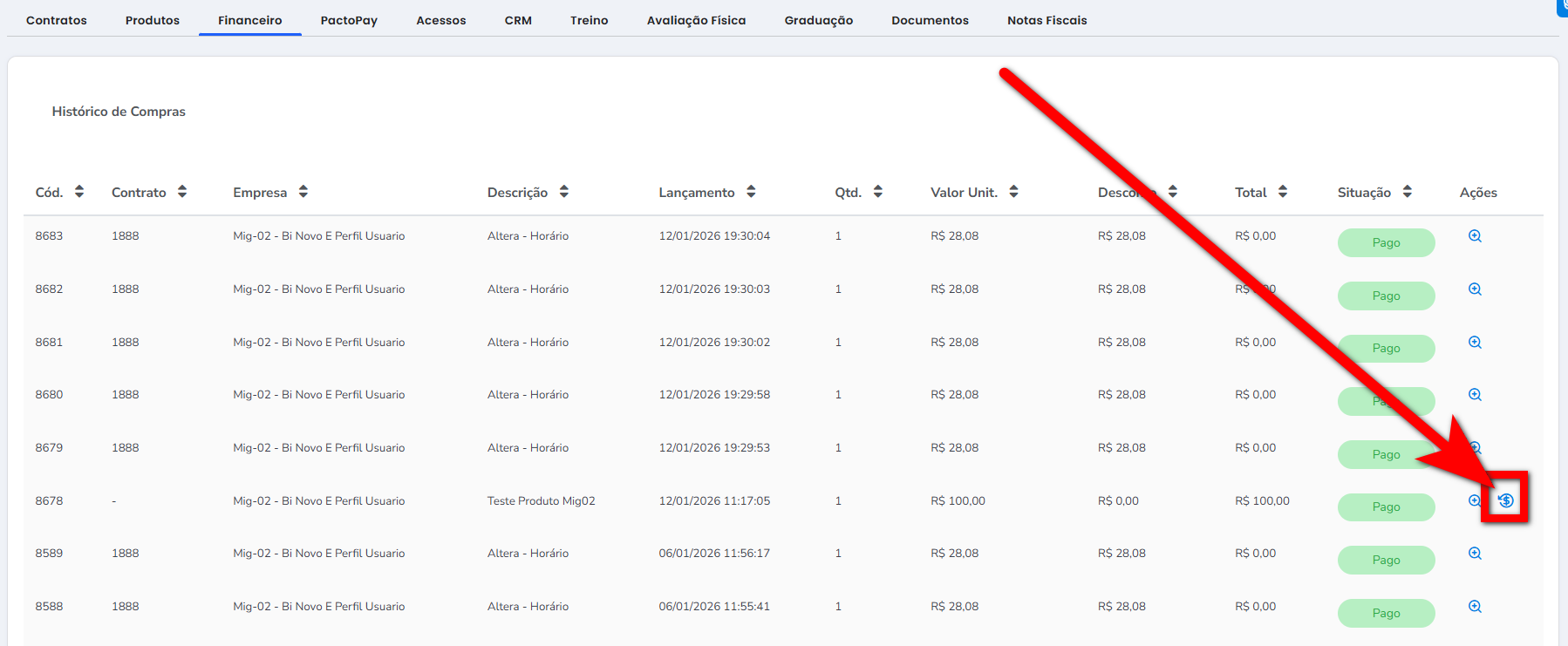 2. No bloco "Histórico de Compras" localize o produto vendido ao cliente que será realizado o estorno;