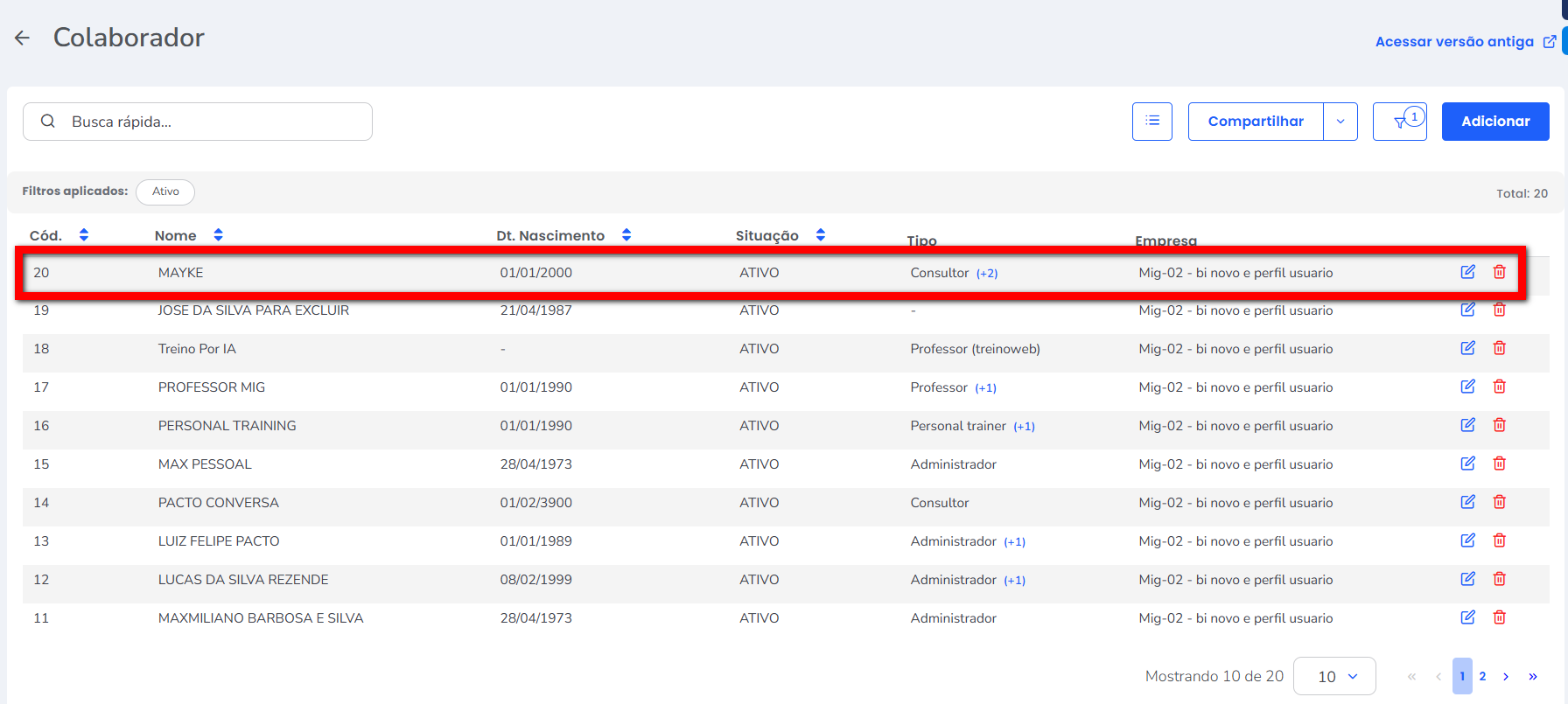2. Será apresentado uma nova tela, listado o cadastro de todos os colaboradores registrados na sua empresa. Identifique o cadastro do colaborador que deseja estornar a venda do produto e clique em seu nome;