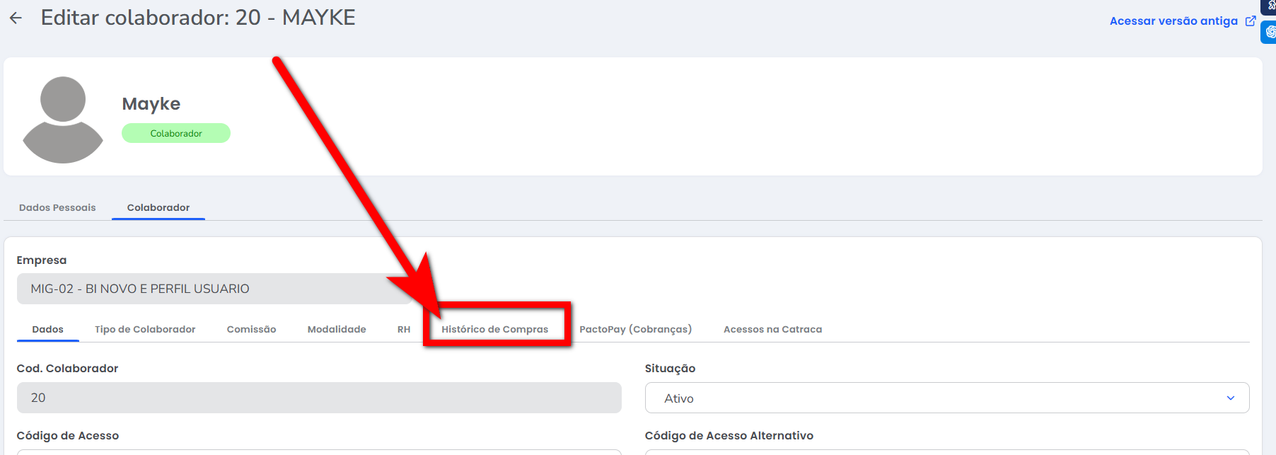3. Na tela de cadastro do colaborador, clique na guia "Histórico de compras";