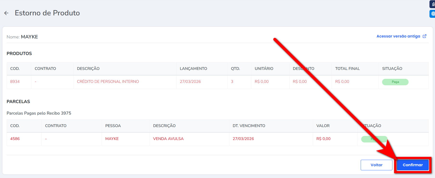 5. O sistema irá exibir uma nova página, com detalhes sobre o produto de estorno, confira todos os dados, e para finalizar clique em "Confirmar".